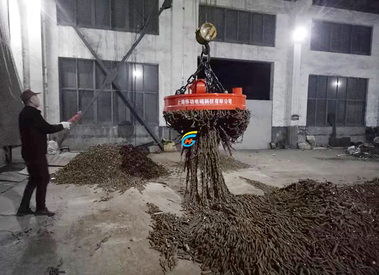 钢筋头用起重电磁铁(废钢起重电磁吸盘)现场操作实景