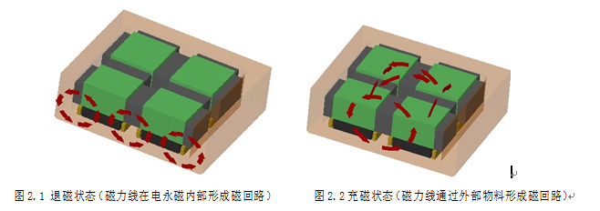 电永磁铁吸力由高能永磁钢提供,电永磁铁进入充磁状态后,吸力不受高温以外的环境因素影响,断电状态保持持吸力。独特的磁路结构设计,通过众多磁钢形成立体闭合磁路,使得磁力线在水平平面区域内形成回路从而产生强大吸力。电永磁铁仅在磁路转换时瞬间使用电能,工作过程中不再需要电能维持磁力,磁路转换快(单通道充/退磁时间≤0.3秒)。退磁状态,铝镍钴磁钢磁场逆转,磁力线在电永磁铁的内部形成回路,电永磁铁工作表面和工件上均无剩磁。